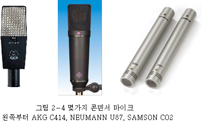 다이나믹 마이크가 값싼+단순+무식+튼튼한 특징(물론 다이나믹 계열에서도 왠만한 콘덴서 이상 가는 성능을 가진 녀석도 있다.. 매우 비싸지만)을 지니고 있다면, 콘덴서 마이크는 가격이나 성능이나 고급 마이크의 대명사라도고 할 수 있다. 콘덴서 마이크는 이름에서도 알 수 있듯이, 콘덴서(Capacitor-축전기)의 동작원리를 이용한 마이크이다.