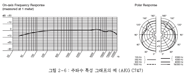 위 그림 2-6의 왼편에 AKG의 C747마이크의 주파수 응답 곡선이 있다. 이 곡선을 보면 30㎐~300㎐까지는 완만한 곡선을 그리다가 300㎐~3,000㎐ 구간에 평탄(Flat)하고 한번 출렁였다가 11,000㎐ 부근에서부터 하향곡선을 그리고 있음을 알 수 있다. 즉, 20~20,000Hz 까지 레벨이 일정한 소리를 이 마이크로 수음하면, 이렇게 깎이고, 더해지고 해서 그 출력이 이렇게 변해서 출력된다는 소리다.
