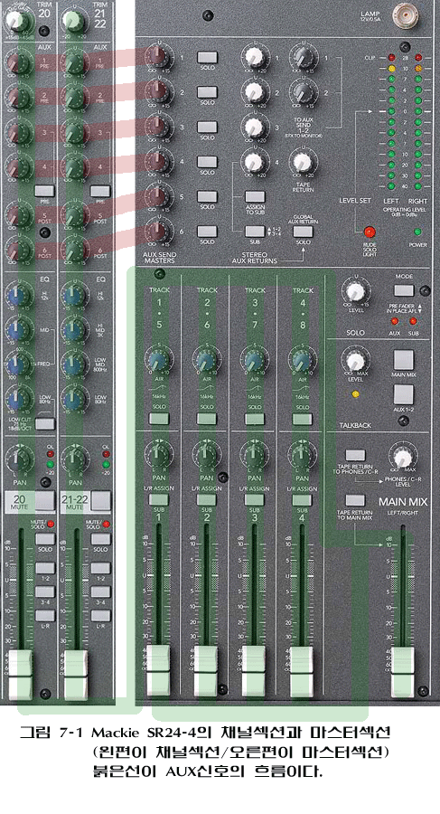 믹서의 주 신호 흐름은, 그림 7-1의 녹색 선 처럼, 신호가 위에서 아래로 죽~ 내려간다고 생각하면 편하다고 했다. 그런데, 그와는 달리 가로방향으로 붉은 선이 하나 그려져 있다. 각 채널의 AUX1이 마스터섹션의 AUX1로 모이고, 각 채널의 AUX2가 마스터섹션의 AUX2로 모이고.. 채널섹션에 있는 AUX놉 (Knob : 돌릴 수 있는 손잡이가 붙은 형태의 스위치를 뜻한다.) 들은 해당하는 채널의 소리를 AUX1부터 AUX6까지 얼마나 보낼것인가를 조절하는 놉이다.