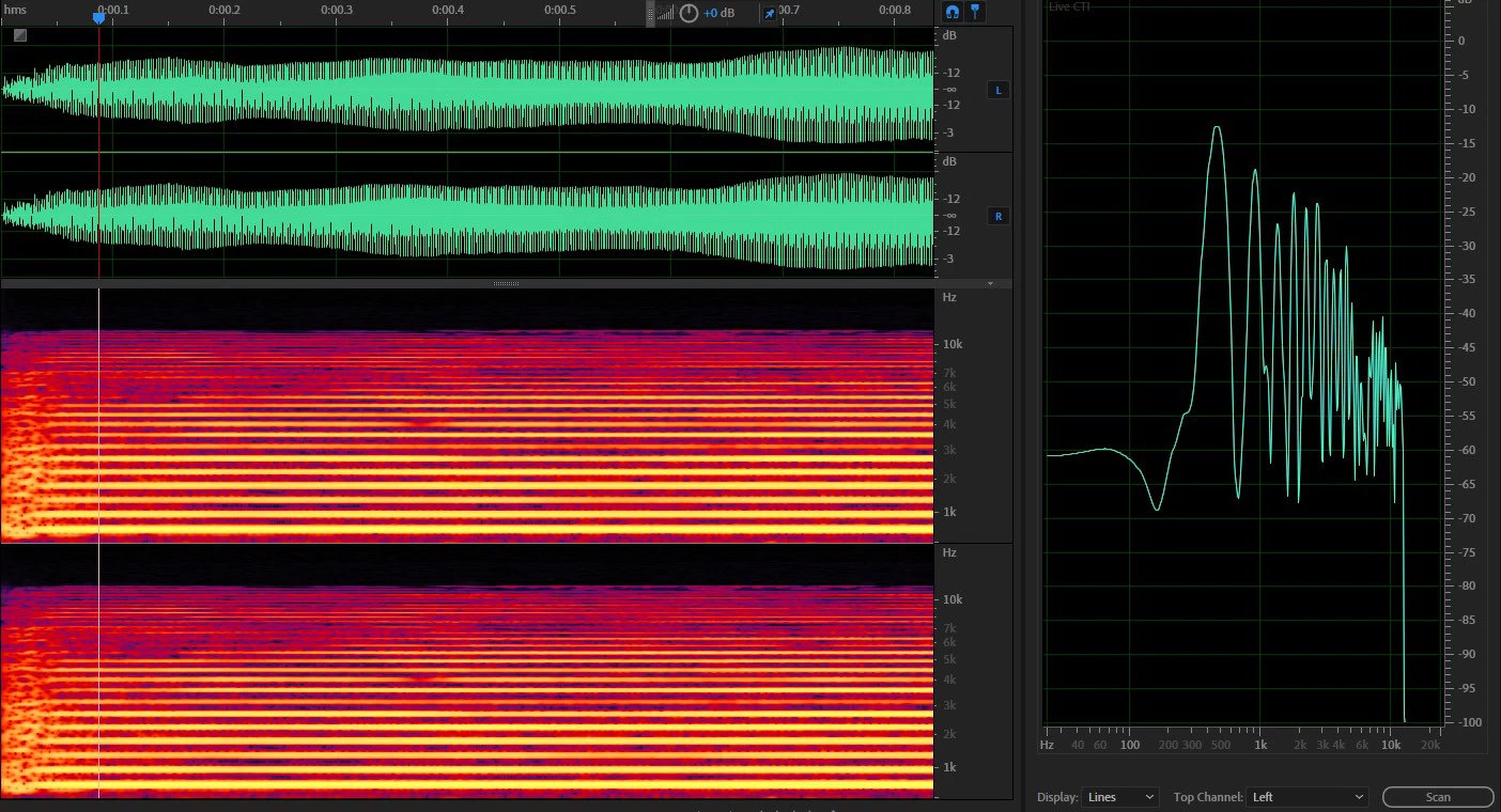 위에 보이는 그림은 440Hz 정현파 (순수한 사인파)의 신호를 분석한 그래프이다. 위에는 엔벨롭(Envelope) 그래프가, 하단에는 시간에 따라 주파수 분포를 표현한 스펙트럼(Spectrum) 그래프, 오른쪽에는 RTA(Real Time Analyzer)그래프가 위치하고 있다.