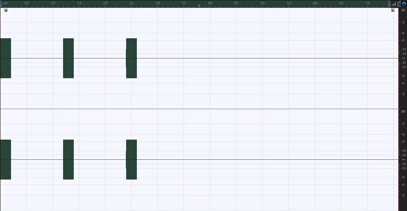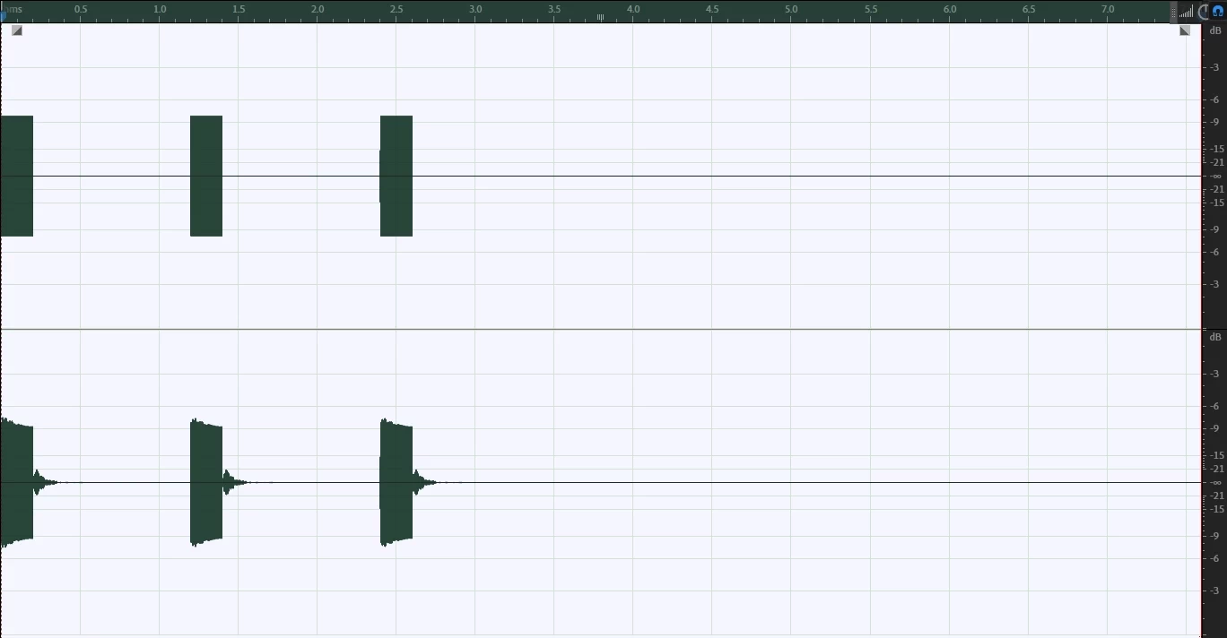 위의 그래프는 1Khz 정현파를 200ms 동안 1초 간격으로 3회 재생한 원음의 엔벨롭 그래프이고, 아래의 그래프는 지연 시간 348ms, 감쇄율 84% 에코를 적용한 엔벨롭 그래프이다. 동일한 소리가 레벨이 줄어들며 반복되는 것을 알 수 있다.