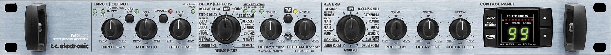 본 강좌에서는 아날로그 장비의 직관적인 조작감을 유지하면서도 디지털 프로세싱을 적용한 TC Electronic의 M350을 예로, 이펙터의 사용 방법과 주요 용어 및 설정 방식을 함께 살펴보고자 한다. 이 글을 작성하고 있는 2025년 기준으로 단종된 장비이긴 하지만, 단종 장비가 현역으로 당당히 굴러다니는 경우는 매우 흔하고, 개념을 익히는 데는 아날로그 장비가 더 유용한 경우가 많다.