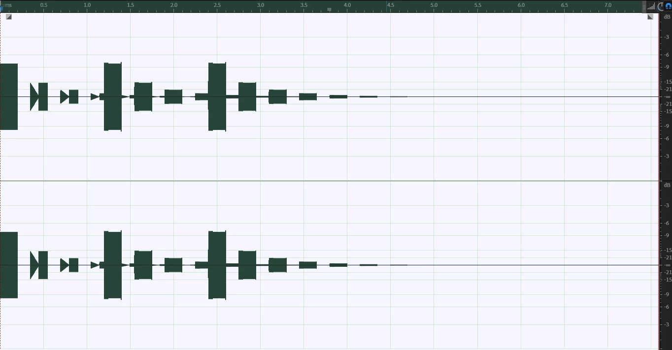 우리 주위에서 쉽게 에코를 경험할 수 있는 곳은 산도 있겠지만 바로 노래방이다. 노래방에서 마이크를 떨어뜨린 경험이 다들 있을 것이다. 마이크를 바닥에 떨어뜨리는 ‘퉁’ 하는 소리가 나고, 점차 소리가 작아지며 일정한 시간 간격으로 ‘퉁 퉁 퉁 퉁’ 하는 소리가 이어진다. 원음과 원음에 이어지는 효과음이 서로 분리되어 있다는 것을 충분히 느낄 수 있고, 효과음은 단지 원음의 레벨이 줄어든 것 일뿐 동일한 소리가 들린다. 이것을 엔벨롭 그래프로 보면 다음과 같이 보이게 된다.