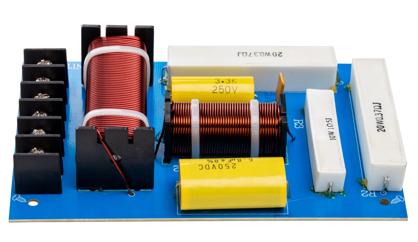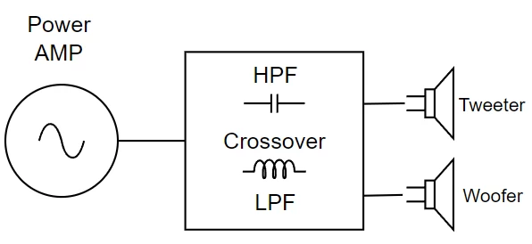 크로스오버 회로는 교류에서 고음역을 통과시키는 HPF(High Pass Filter)의 역할을 담당하는 콘덴서(Capacitor)와, 저음역을 통과시키는 LPF(Low Pass Filter)의 역할을 담당하는 코일(Inductor), 그리고 저항으로 구성된다. 이것들을 조합하여 주파수 별로 신호를 분리해 낸다.