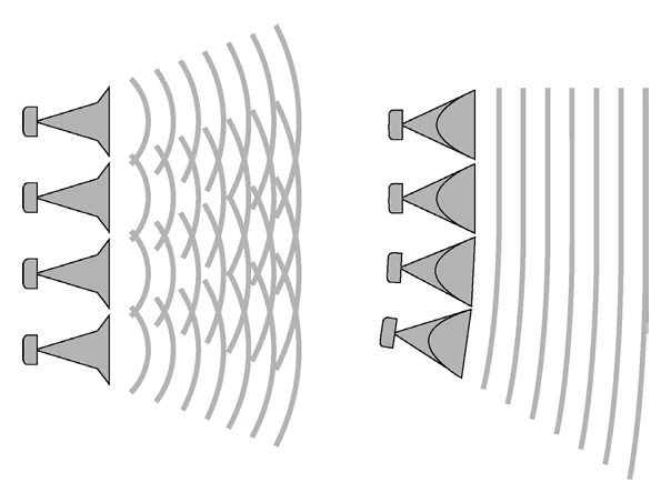 포인트 소스 스피커의 경우 각 스피커의 출력이 서로 간섭을 일으키기 쉽고, 불필요한 방향 (수직 상방 : 하늘) 으로 퍼져 나가는 출력들도 있어서, 필요한 방향으로 소리를 집중하는 능력이 떨어진다.